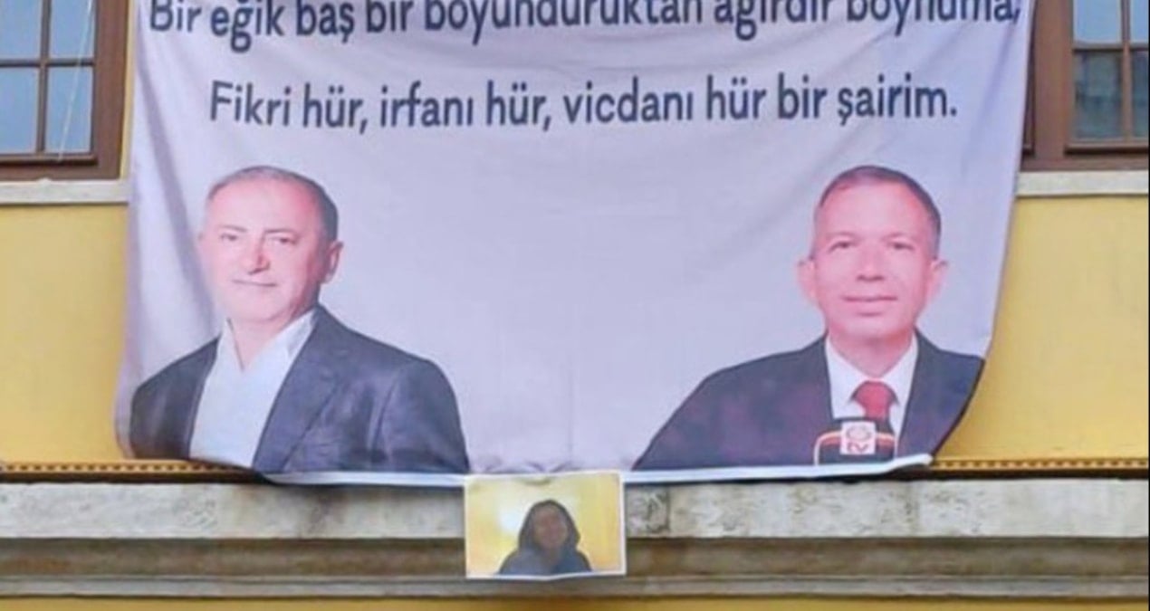 Pankartta, “Bir eğik baş bir boyunduruktan ağırdır boynuma; Fikri hür, irfanı hür, vicdanı hür bir şairim” ifadelerine yer verildi.